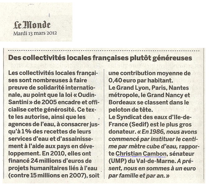 Dans le cadre du 6ème forum mondial de l’eau à marseille, Martine Valo, journaliste au quotidien Le Monde, a rappelé que les communes peuvent consacrer 1% des recettes de leurs services d’eau et d’assainissement à l’aide aux pays en développement. Elle a rencontré Christian Cambon qui lui a précisé que le Syndicat des Eaux d’Ile-de-France (SEDIF) était le plus important donateur.