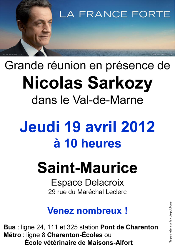 Nicolas Sarkozy tiendra son premier et seul meeting dans le Val-de-Marne jeudi 19 avril prochain, à 10h à Saint-Maurice.