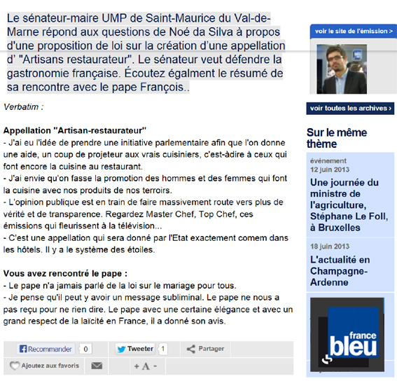 Christian Cambon était l’invité politique de France Bleu. Il a répondu aux questions du journaliste, Noé da Silva, à propos de sa proposition de loi sur la création d’une appellation d’ « Artisan restaurateur » et de sa rencontre avec le Pape François.