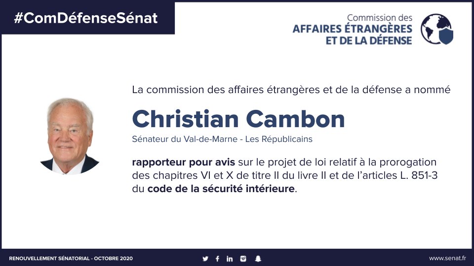 Christian Cambon a été nommé rapporteur pour avis sur le projet de loi relatif à la prorogation des chapitres VI et X de titre II du livre II et de l’articles L. 851-3 du code de la sécurité intérieure.