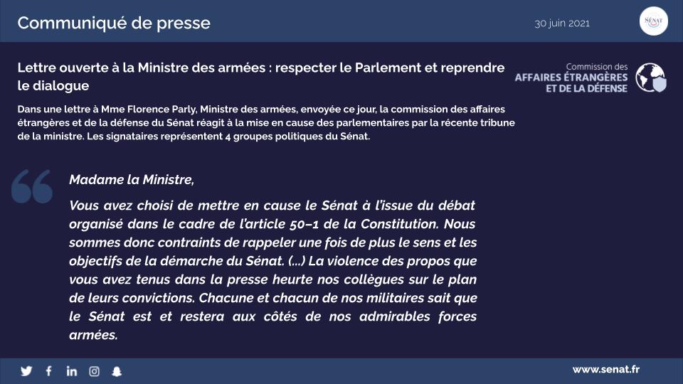 La commission des affaires étrangères du Sénat, présidée par Christian Cambon, réagit à la mise en cause des parlementaires par la récente tribune de Florence Parly :