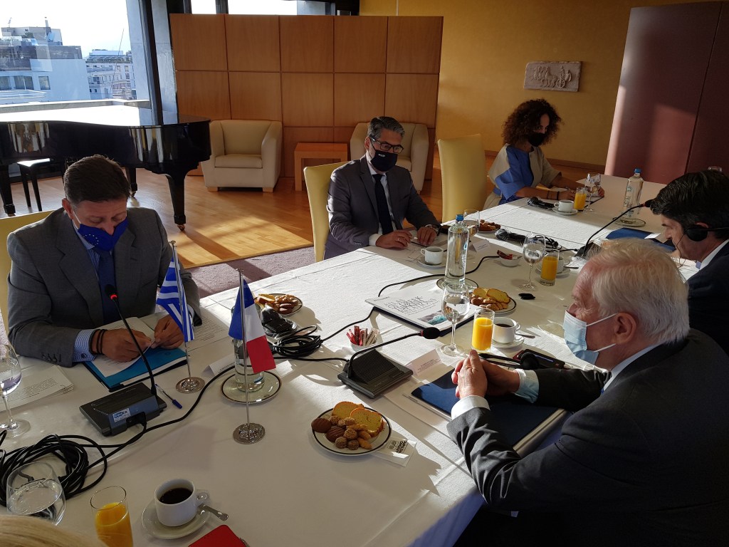 Réunion avec le Ministre de la Défense M. Panagiotou, le Ministre des Affaires européennes M. Varvitsiotis, le Président M. Gioulekas et les collègues de la Commission de la défense du Parlement grec. « L’expression d’une alliance solide et amicale dans une région tourmentée. » explique Christian Cambon.
