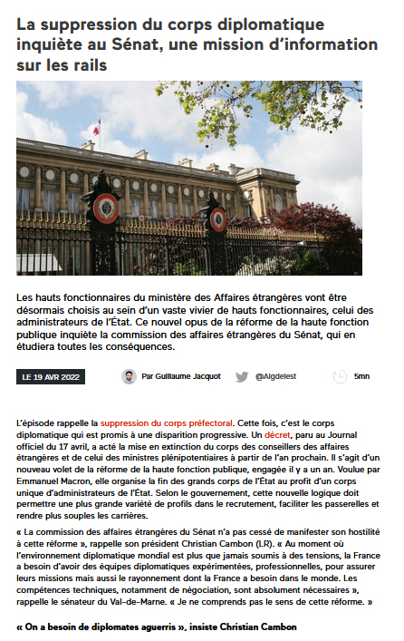19 avril 202221 avril 2022 Christian Cambon Inquiétude sur la suppression du corps diplomatique > Article de Public Sénat Partager :Partager Cliquer pour envoyer un lien par e-mail à un ami(ouvre dans une nouvelle fenêtre) E-mail J’aime chargement… Sur le même thème