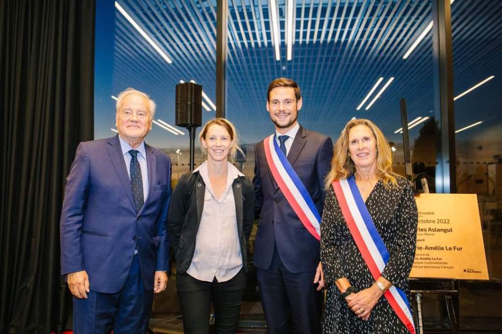 Inauguration du nouveau gymnase de Bry-sur-Marne avec son Maire Charles Aslangul et la championne paralympique Marie Amelie Le Fur. « Quel bel encouragement de donner le nom de cette athlète multimedaillée pour tous les sportifs souffrant de handicap ! » a indiqué Christian Cambon.