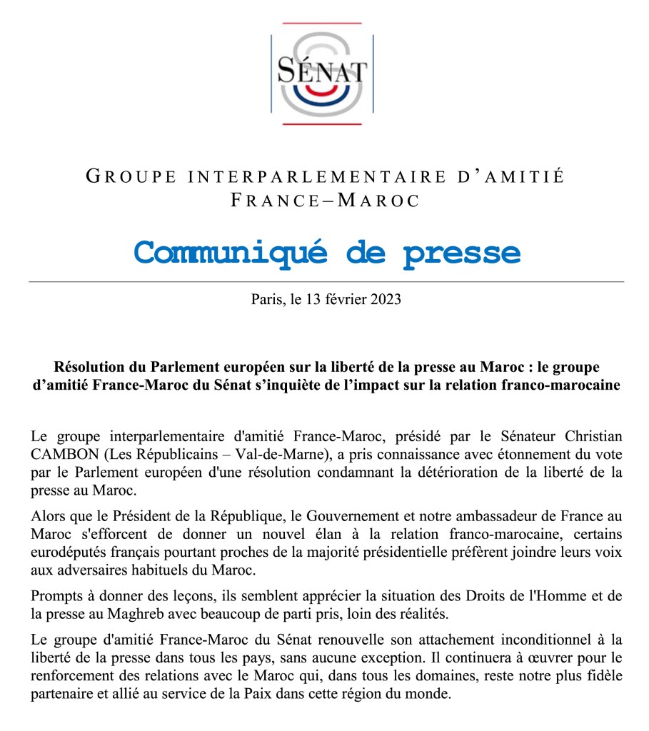 Résolution du Parlement européen sur la liberté de la presse au Maroc : le groupe d’amitié France-Maroc du Sénat s’inquiète de l’impact sur la relation franco-marocaine