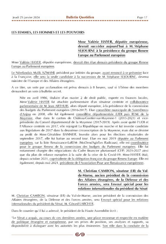 Le président Gérard Larcher vient de nommer officiellement Christian Cambon, Envoyé spécial du Président du Sénat pour les Relations internationales. « Je tiens à le remercier de cette marque d’estime et de confiance qu’il me témoigne.Je l’assure de ma totale disponibilité et de mon engagement pour cette mission. Ainsi à ses côtés et sous son autorité, je contribuerai à renforcer l’action du Président du Sénat à l’international, avec une seule priorité : Savoir dialoguer avec tous pour faire avancer la Paix. » a précisé le sénateur.